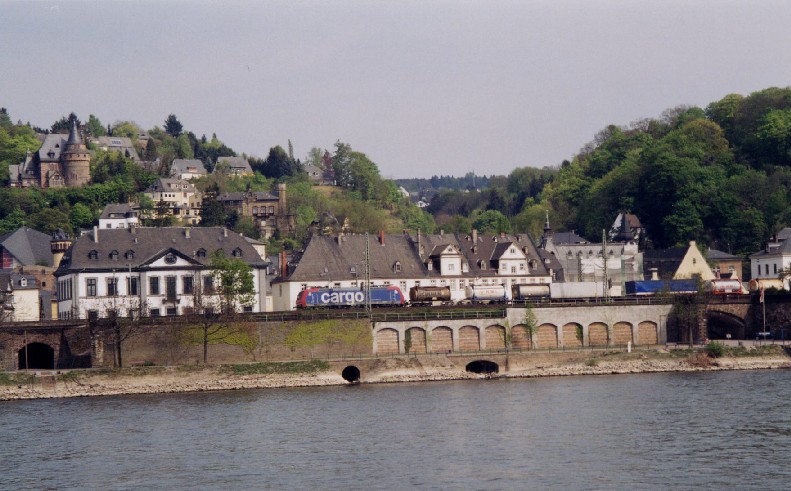 A Swiss class 482 makes its way along the banks of the River Rheine at Koblenz on Friday 25th April 2003.