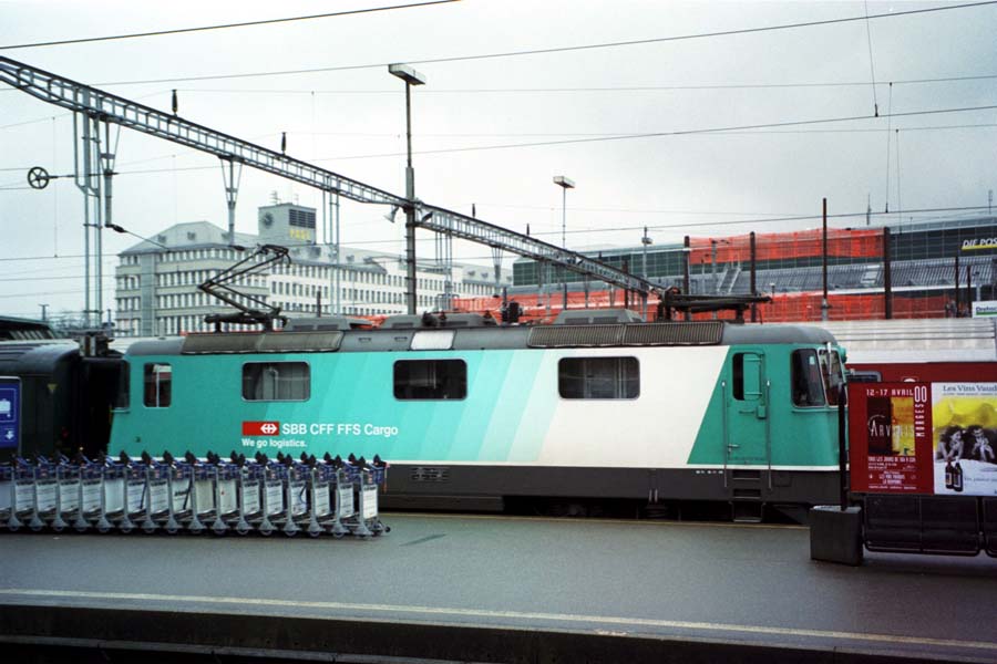 Die Re 4/4 II 11276 im "Cargo Design" mit einem Regionalzug im Hauptbahnhof Zürich. Feb. 2000 Photo: A. Senn; http://www.senn.ch |