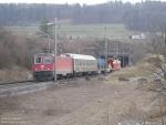 wiederum zwei Hupac S, davon einer beladen mit Schienen und am Zugschluss ein