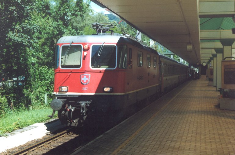 Schweizeriche Bundesbahnen locomotive Re 4/4 II 11197 with an international train from Germany, on his way to Zürich (CH), at Bregenz station (A). Photo by Timo Millitz on the 6th day of August (1999). Timo Millitz: email: millitz@hotmail.com ; homepage: http://millitzrail.cjb.net |