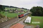 | Re420 remorquant le "Pablo Casal" Barcelon - Genève - Lausanne - Fribourg - Bern - Zürich. Depuis le sommet de l'entrée du tunnel de Vauderens |