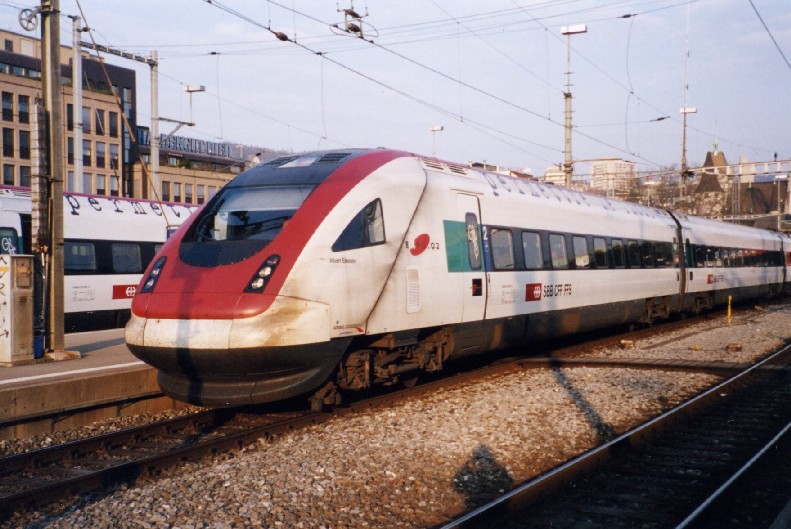 SBB tilting train class RABe 500 pictured we think at Zurich HB in April 2002.