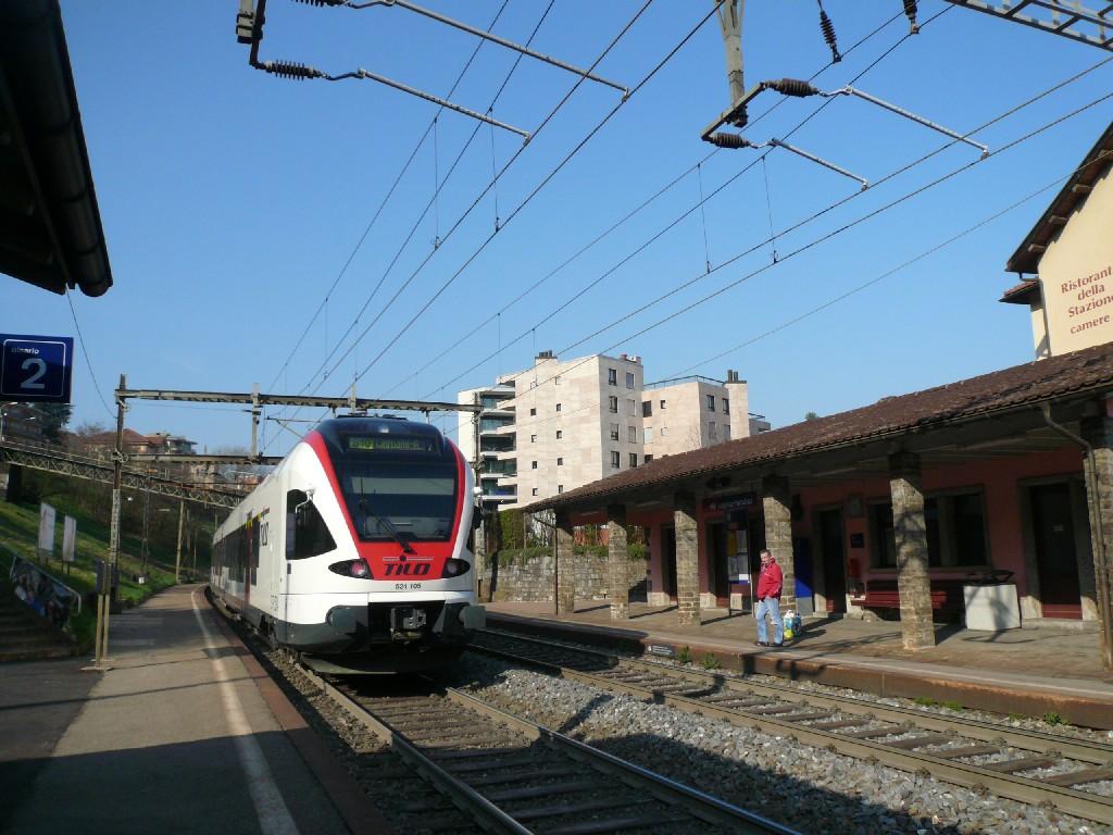| In 2003 the SBB CFF FFS started operating the lines from Basel SBB and Weil am Rhein via Lörrach to Zell im Wiesental, after an interim service with NPZ units they took 30 FLIRT units RABe 521 into service, which are low-floor and airconditioned. With two trains each hour on each line, this helped to considerably increase ridership. Each unit has two pantographs, one wide for Germany, one narrow for Switzerland - but for the lines where they normally operate, only the wide pantograph is needed. Here we see the 94 85 0 521 006-2 in Lörrach, 2011-09-29. |