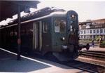 SBB train to Suhr - Aarau at Zofingen station, probably in 1989. Visible are a 2nd class "Leichtstahlwagen" (light steel wagon) and the BDe 4/4 1636. Later, this line used NPZ trains, since 2003 Seetal RABe 520 are in service. The section Suhr-Aarau will be converted to 1000mm gauge and served by AAR in the future.