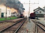 ein Wagen ein Radlager verlor und entgleiste. Im westlichen Teil des Bahnhofareal. Quer über die Gleise liegt ein Hochspannungsmast der Versorgungsleitung. Dieser fiel genau zwischen zwei Wagen herunter. Langsam konnte der Brand kontrolliert gelöscht werden. 8. Mar. 94 |