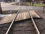 Kollbrunn, Uebergang Nussbergstrasse (ASSA-Antrieb). Strassendetail. Der Schienenzwischenraum beim Fussgängerübergang ist mit Holzbrettern ausgefüllt. Kollbrunn, crossing Nussbergstrasse (with ASSA drive). Road detail. 1 march 2003, digital photo by Felix Geering (f_geering@yahoo.de) |