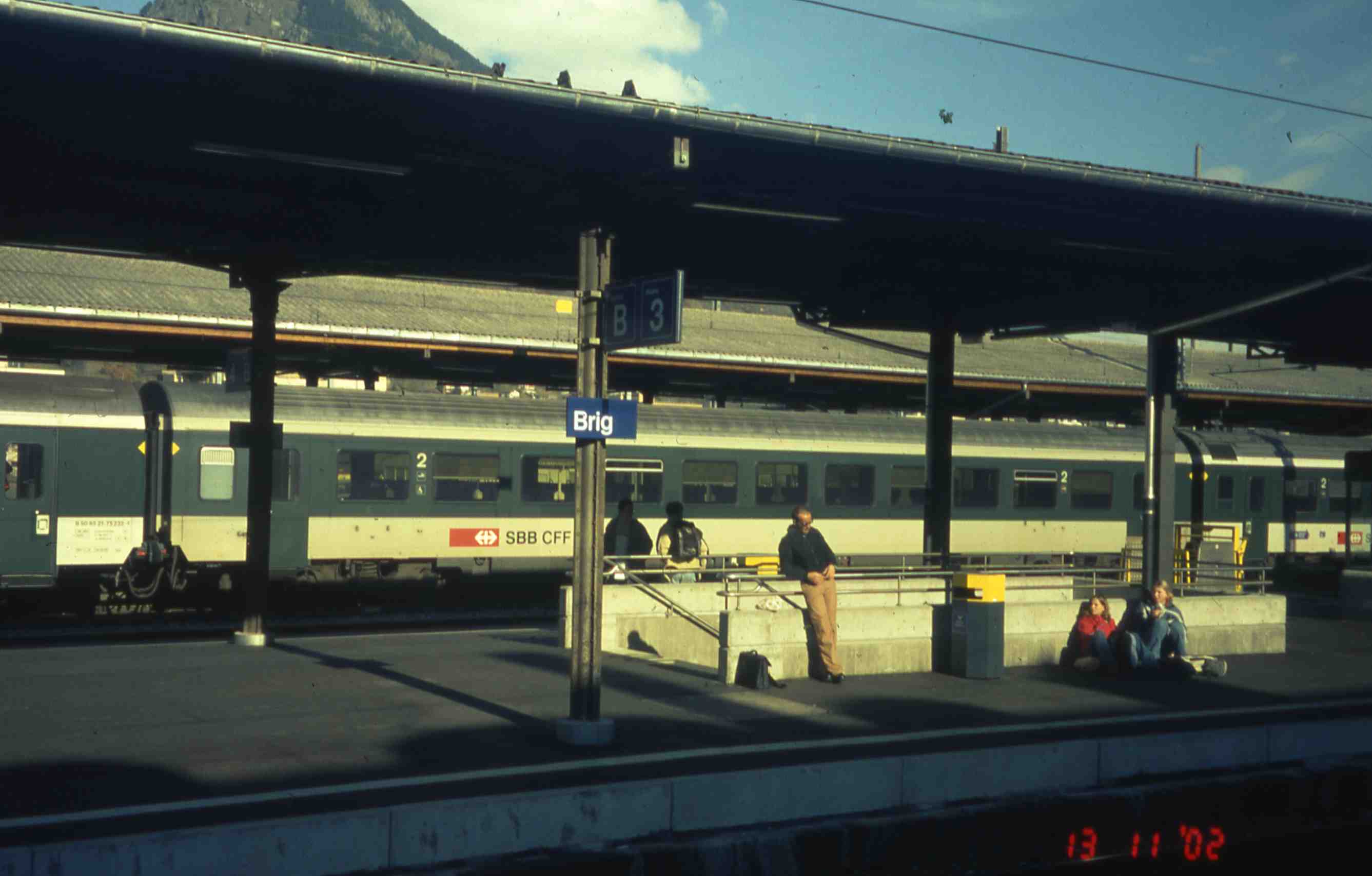 The north end of the Brig SBB train station. Here is a welcome sign for Brig. Brig is the largest city in the "Oberwallis" German-speaking section of the canton of Valais, while Sion (Setten in German) is the cantonal capital of Valais, and is in the French-speaking part of Valais, known as "Valais Romande". The station announcements are primarily in German, as opposed to French, Italian or English, which come after the German announcements. For those travelling eastward to Chur, this is the last station that a Eurail Pass or similar pass is accepted. Those travelling via Disentis / Muster on to Chur must buy a special ticket for the Gletscherbahn. Taken sometime in the late morning, on 13 November 2002. © 2002, 2006 Josh Hanz (josh_hanz@hotmail.com) |