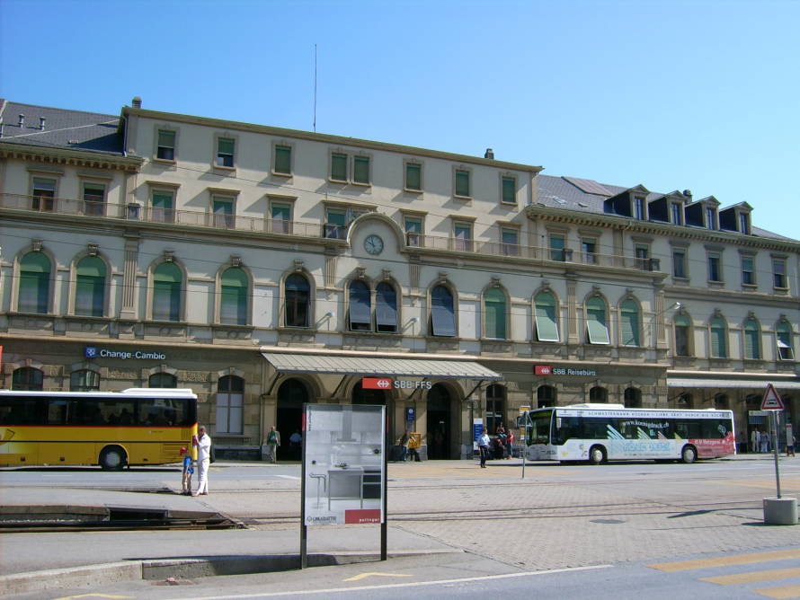 The front of the Brig SBB train station. Brig is the largest city in the "Oberwallis" German-speaking section of the canton of Valais, while Sion (Setten in German) is the cantonal capital of Valais, and is in the French-speaking part of Valais, known as "Valais Romande". The station announcements are primarily in German, as opposed to French, Italian or English, which come after the German announcements. For those travelling eastward to Chur, this is the last station that a Eurail Pass or similar pass is accepted. Those travelling via Disentis / Muster on to Chur must buy a special ticket for the Gletscherbahn. Taken sometime in the late morning, on 13 November 2002. © 2002, 2006 Josh Hanz (josh_hanz@hotmail.com) |
