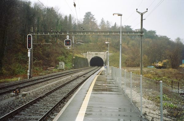 • Left: single track (1.5kV DC) to/from La Plaine and Bellegarde, for Geneva-France traffic. This track then joins the chord of La Praille-Ouest, through an underground dive-under (off-pic);