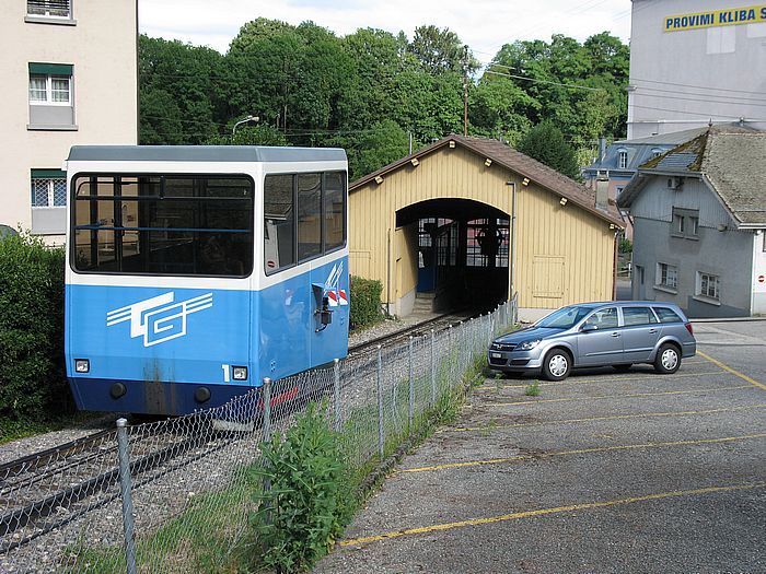 Cossonay funicular is arriving at the lower station. 23.6.2007 Martin P. |