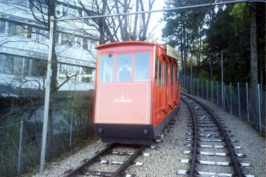 | Zürich Polybahn. This is a Polybahn cable car heading downward to Central from ETH Zürich. Taken 4 July 1997. (C) 1997, 2005 Josh Hanz (josh_hanz@hotmail.com) |