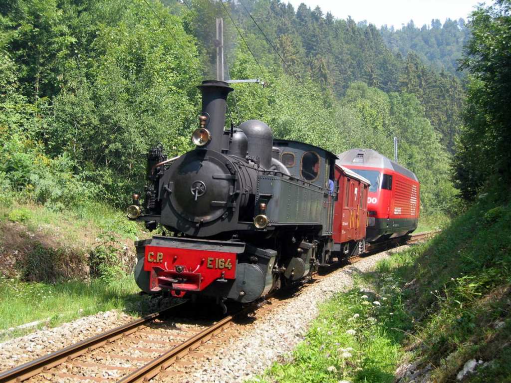 never by rail. The steam locomotive E 164 was delivered in 1905 by Henschel in Cassel to Portugal. Today this factory is absorbed by the Bombardier group. In 1993 the steam engine was brought back to Switzerland in 1993 by La Traction. It entered service in 1999 after a general overhaul in Meiningen on the metric network of Chemins de fer du Jura. The SBB Re 460 036-7 was built by SLM and ABB in Winterthur and Zurich and delivered in 1993. Both works haven been taken over by the Bombardier group. Today there are no more factories, but engineering sites. It is one of the few locomotives which have not been named till today and which spot no advertising livery.