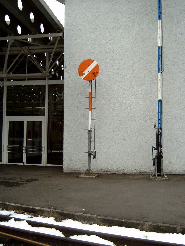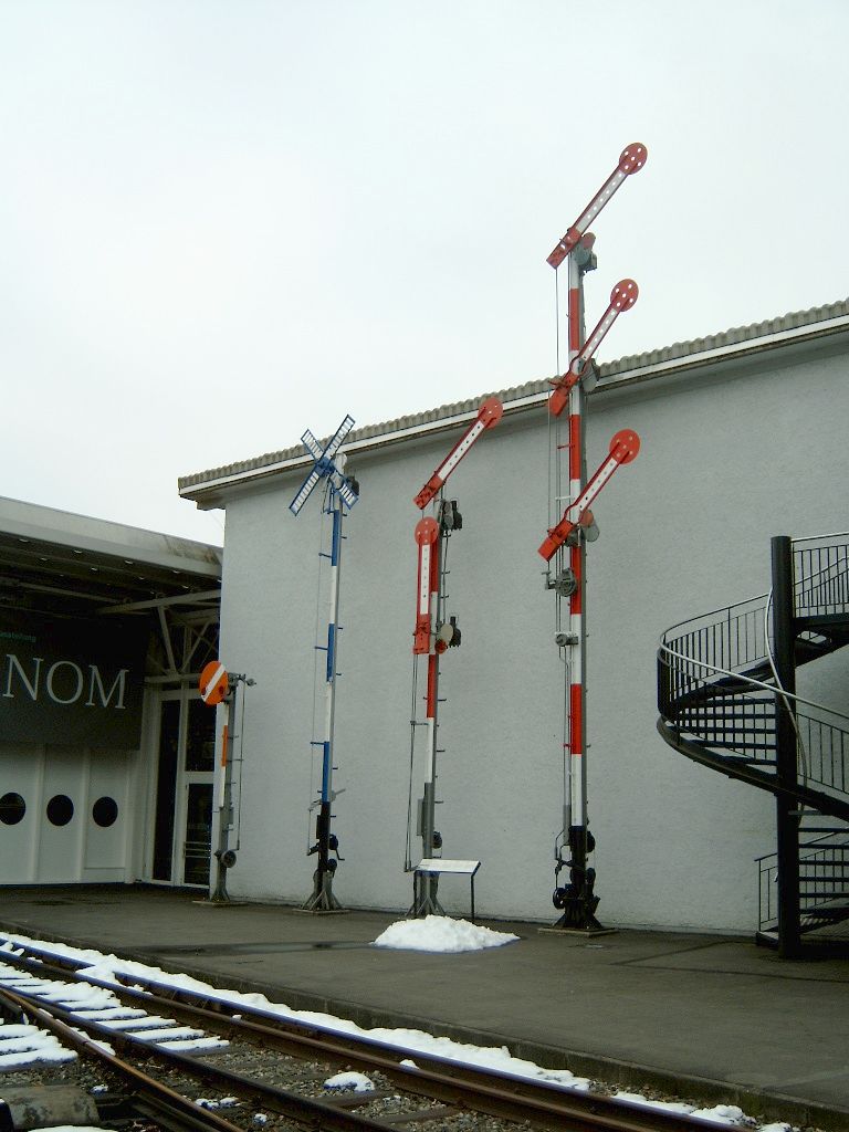 horizontal position, thus invisible for the train). Shunting signal in position "shunting forbidden" (the other position, "shunting allowed", has both bars in the vertical position). Main signal showing "clear without speed restriction". Main signal showing "Clear with speed restriction" and the additional meaning that the train goes into another track than it would with only two arms in the diagonal position. Luzern (Verkehrshaus), 2003-02-11