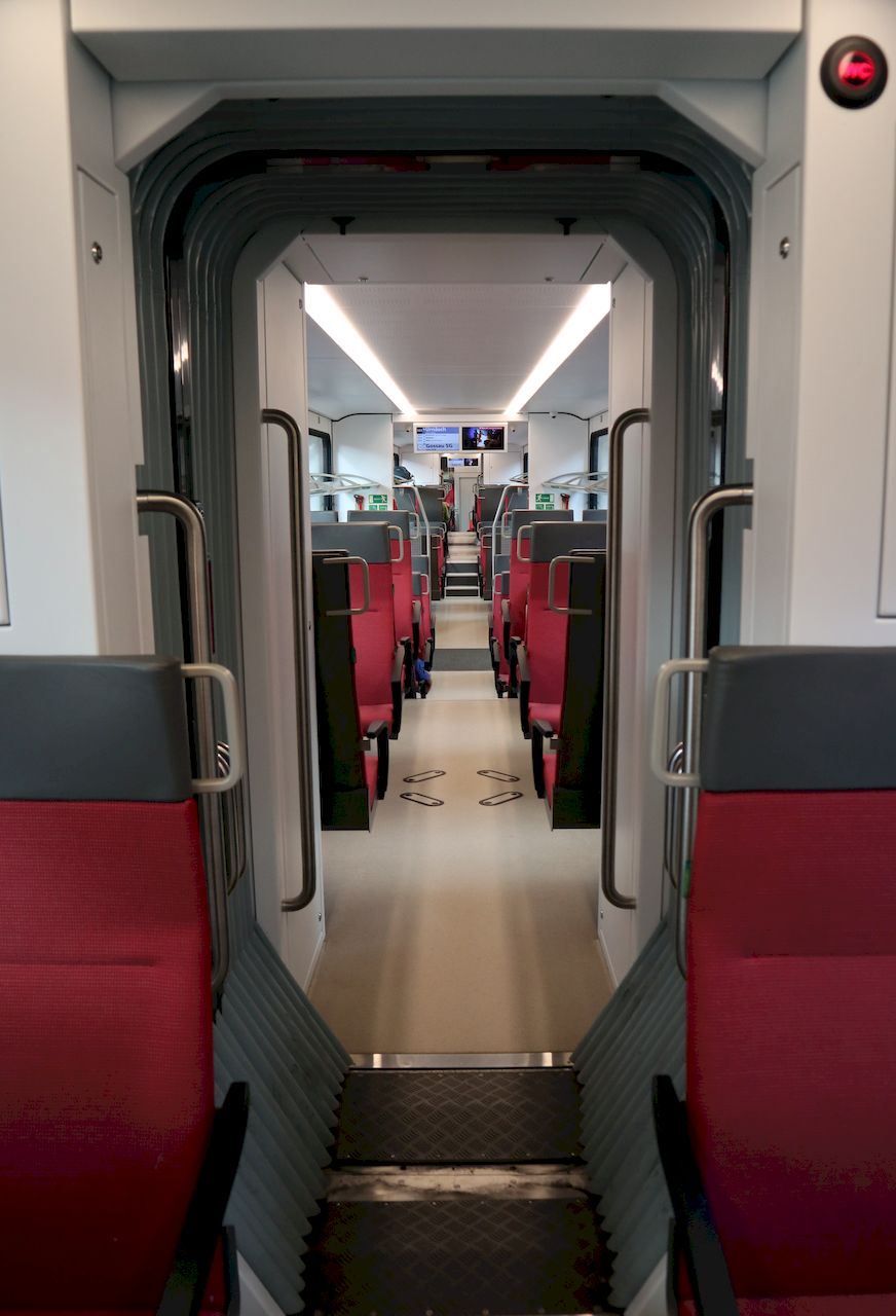 | Appenzeller Bahnen ABe 4/12 1002 "Walzer" named "Bloch", built 2018 by Stadler, interior of second class, gangway between two cars, 2019-09-30. |