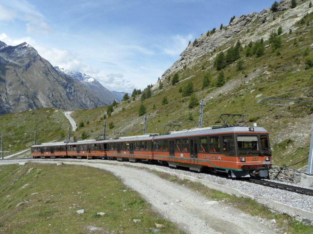 Treno per Zermatt a Riffelboden. Sulllo sfondo il Cervino (Matterhorn)