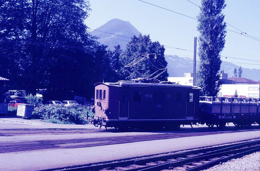 BOB HGe 3/3 25 mit verschiedenen Güterwagen in Interlaken Ost. 1987. Photo and scan by M.Koblischka |