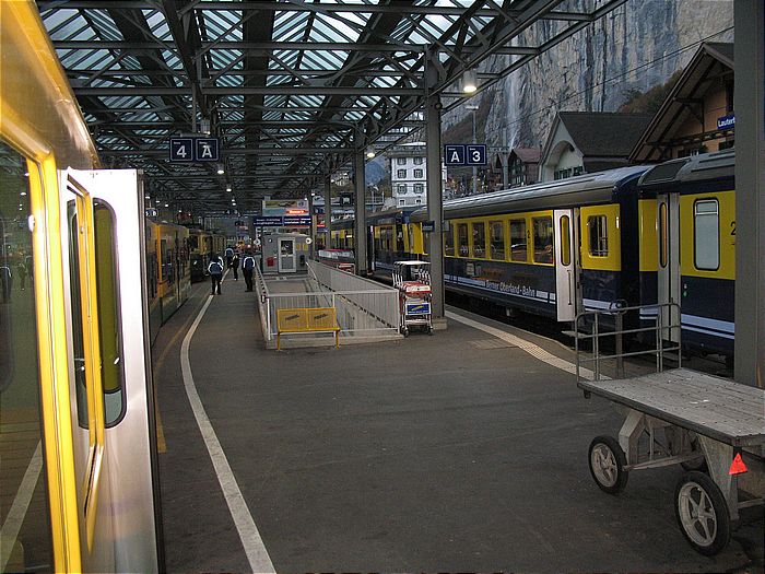 Lauterbrunnen. Left: Train to Kleine Scheidegg. Right: Train to Interlaken Ost 14.10.2007 Martin P. |