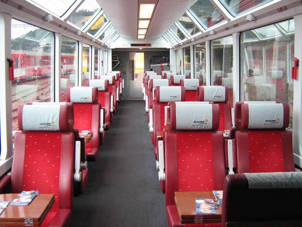 Interior of a 1st-class "Premium" panorama car of MGB, seen in the consist of D 911 "Glacier-Express" (St Moritz ---> Zermatt).