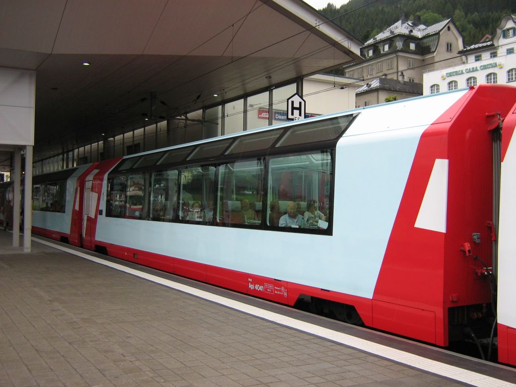 1st-class "Premium" panorama car (Api 4041, with facilities for disabled persons) of MGB, seen in the consist of D 911 "Glacier-Express" (St Moritz ---> Zermatt).