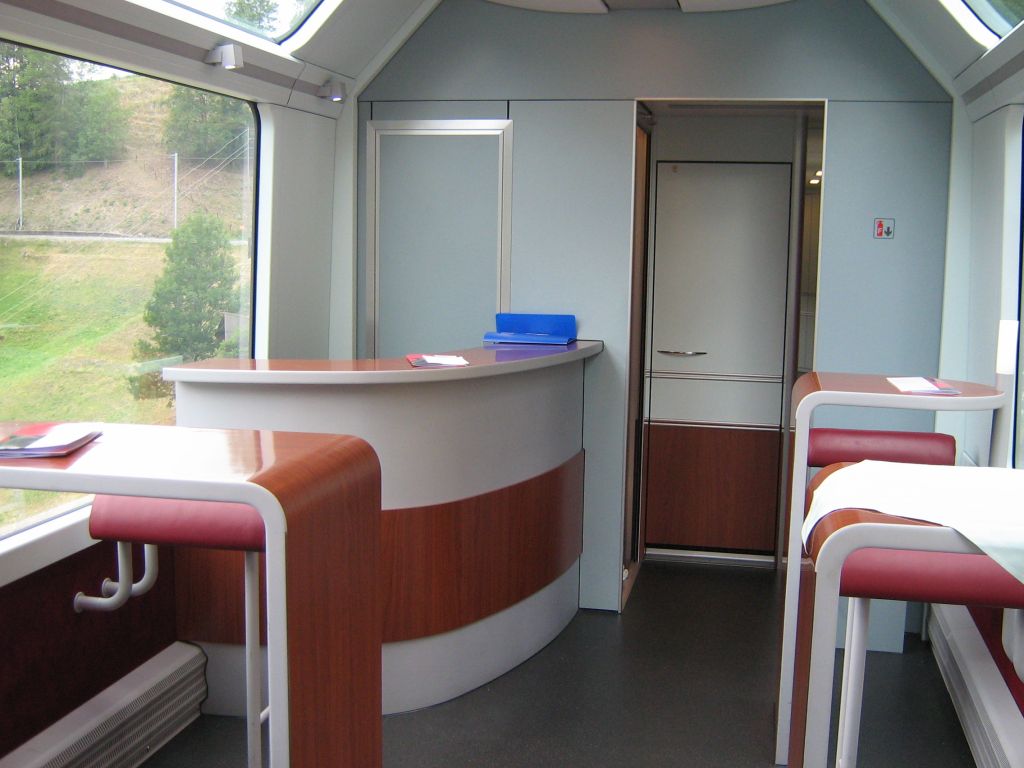Interior of a Bar/Galley "Premium" panorama car of MGB, seen in the consist of D 911 "Glacier-Express" (St Moritz ---> Zermatt).