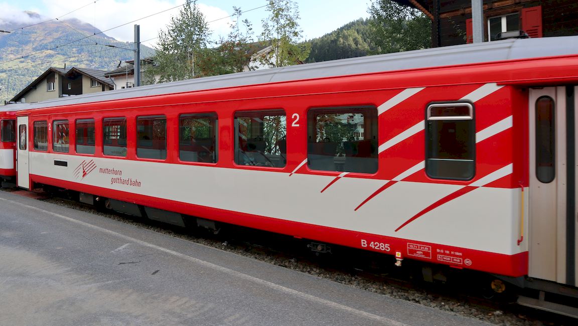 | matterhorn gotthard bahn B 4285, second class car with bicycle space (EW II), built 1980 by SIG. Fiesch, 2019-10-03. |