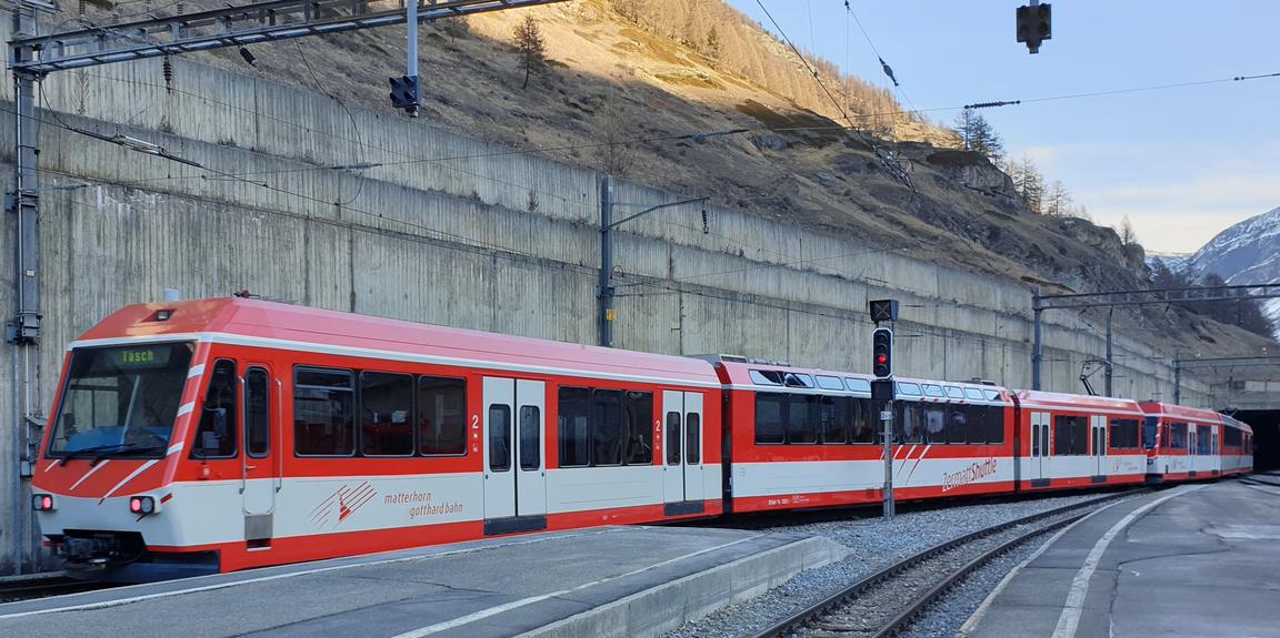 The newest MGB shuttle train (Zermatt-Taesch) in Zermatt. Photo by Stephan R. Schilling. |