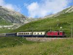 Class HGe 4/4 I (32) of MGB and Pullman cars of RhB, seen on "Alpine Classic Pullman" (Zermatt ---> St Moritz), shortly after passing the Oberalp Pass.