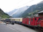The Alpine Classic Glacier Express with a HGe 4/4 I is prepared in Zermatt on 28.07.2007 09:48.