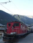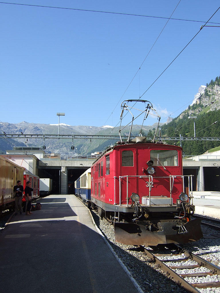 Zahnradlokomotive 32 der Furka-Oberalp Bahn bei Einfahrt in den Bahnhof Disentis mit dem Glacier-Express von Andermatt Cogwheel locomotive 32 of the Furka-Oberalp railway arriving at Disentis station with Glacier-Express from Andermatt