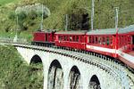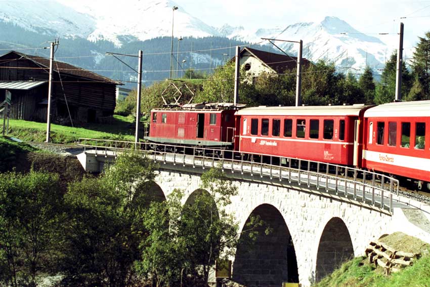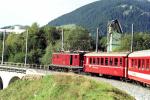 Zug der Furka Oberalp Bahn in der Nähe von Sedrun unterwegs zum Oberalppass. 9. Okt 1999 Photo: A. Senn; http://www.senn.ch |