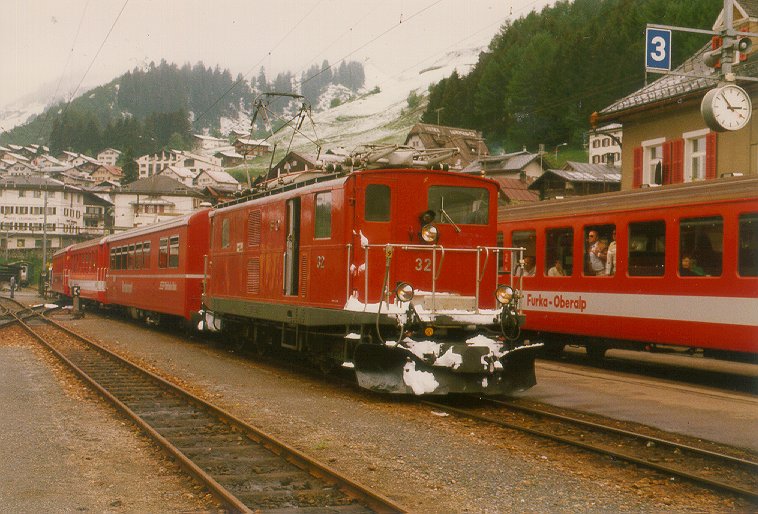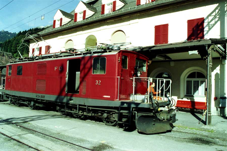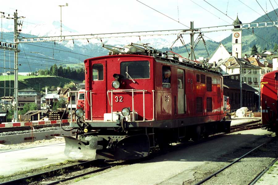 Furka Oberalp Bahn. Die HGe 4/4 I 32 am Rangieren im Bahnhof Disentis. 9. Okt 1999 Photo: A. Senn; http://www.senn.ch |
