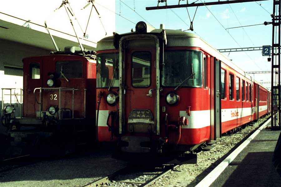 Furka Oberalp Bahn. Ein Steuerwagen der FO steht neben einer HGe 4/4 I 32 im Bahnhof Disentis. 9. Okt 1999 Photo: A. Senn; http://www.senn.ch |