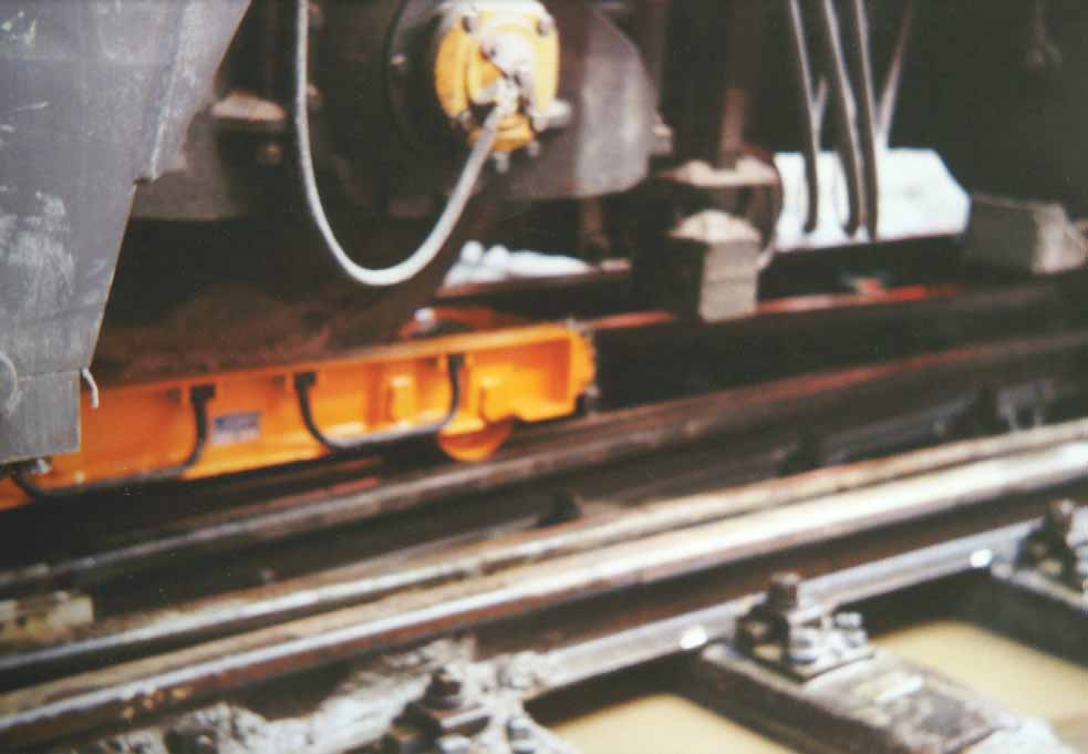 Abtransport der einen defekten Lokomotive. Blick unter das Fahrzeug. Gelb leuchten die Rollschemmel hervor. Auf den Weichen brauchte es sehr viel Fingerspitzengefül, damit der Schemmel nicht entgleiste.