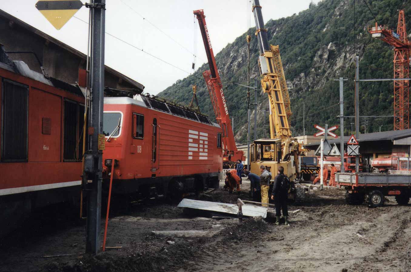 Abtransport der einen defekten Lokomotive. Auf einem Seitengleis ohne Fahrleitung wird die Lokomotive zu den Kranwagen gebracht.