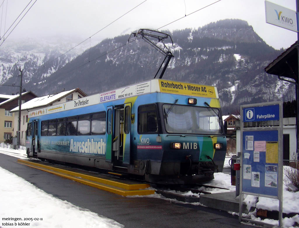 Ein Triebwagen (Be 4/4) der Meiringen - Intertkirchen - Bahn (MIB) im Bahnhof Meiringen. Der Zug kann nicht in den Bahnhof der Brünigbahn einfahren, da die Bahn ein anderes Stromsystem verwendet (1200 V =). Das Fahrzeug wurde von der Firma Stadler gebaut. April 2000 Photo: A. Senn; http://www.senn.ch |