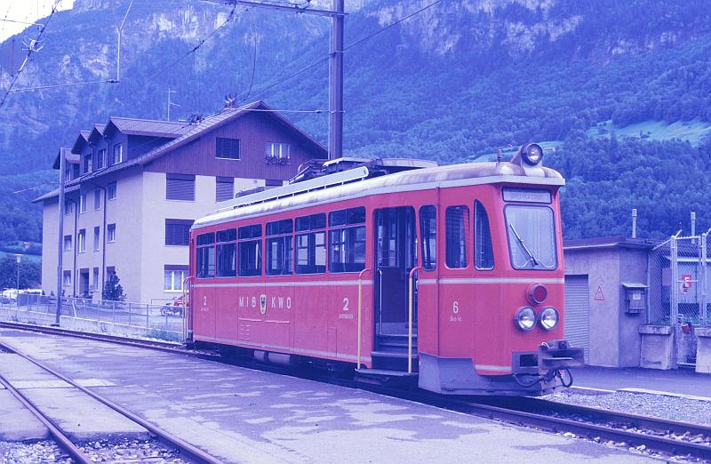 MIB Bem 4/4 6 in Innnertkirchen. Juli 1983. Dieser Tw ist der ehemalige OEG 62 ausgerüstet mit einem Dieselmotor, um in den Bahnhof Meiringen einfahren zu können. Dasselbe gilt aber auch für Anschlussgleise im Kraftwerk. Photo and scan by M.Koblischka |