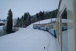 22 February 2002, near Gstaad, Switzerland Local train of the MOB somewhere near Gstaad.