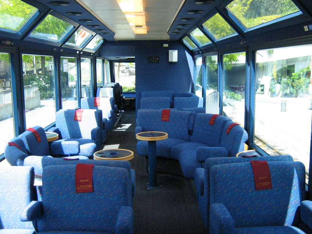 Interior of a 1st-class/Lounge/Cab Mk1 "VIP" Panorama (Observation) car of MOB (Ast-116, ex "Super Panoramic Express", 1985), seen in the consist (rear formation) of IR 3124 "Golden-Pass Panoramic" (Montreux ---> Zweisimmen).