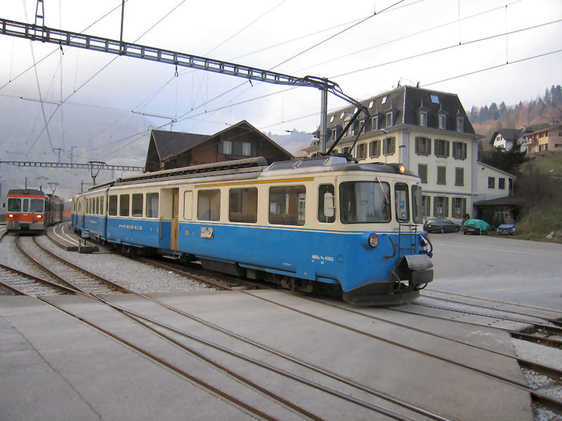 MOB - Switzerland MOB electric trainset ABDe8/8 4003 leaves Montbovon with a local service towards Montreux. On the right, the connecting TPF service to Bulle is waiting. Montbovon, 24-11-2005