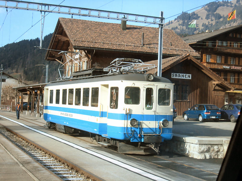 MOB - Switzerland MOB old electric motor car Be4/4 1003 in Saanen, photographed from the VIP seats of a Golden Pass Panoramic train. Saanen, 23-11-2005