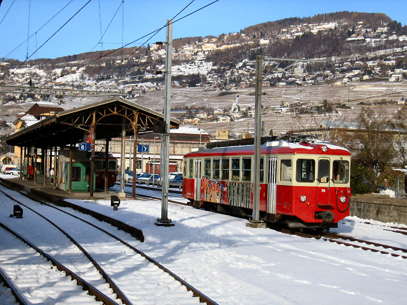 MVR/CEV - Switzerland Graffiti does not exist in Switzerlandā It's rare, but sometimes it can be encountered. Unfortunately I couldn't take another picture of this class without the additional paint work. Montreux-Vevey-Rivièra (former CEV) BDeh4/4 74 in Vevey. The service train is under the roof at the same platform. Vevey, 26-11-2005