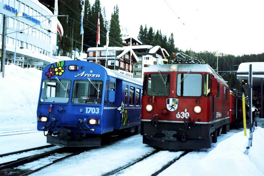 Die Ge 4/4 II neben einem Arosa-Bahn Steuerwagen im Bahnhof Arosa. Jan. 2000 Photo: A. Senn; http://www.senn.ch |