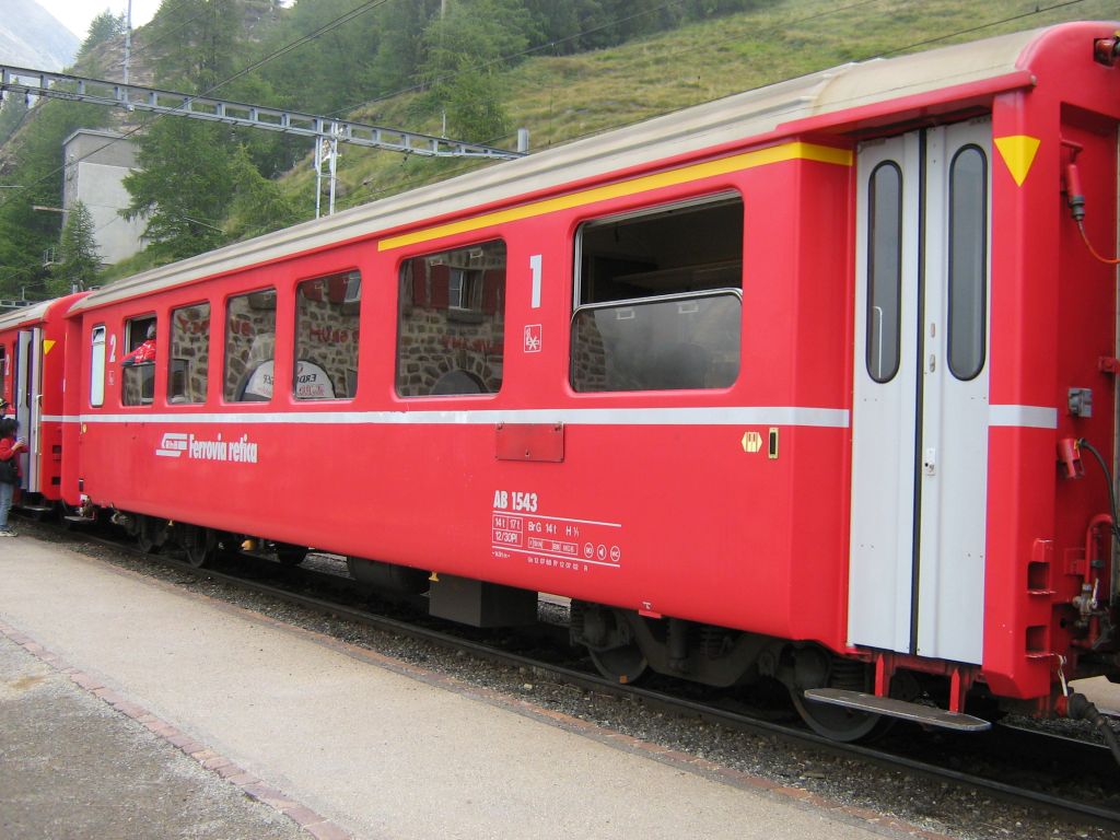 1st/2nd-class (AB-1543) "Bernina" car of RhB, seen in the consist of RE 1642 (Tirano ---> St Moritz, limited stopping pattern).