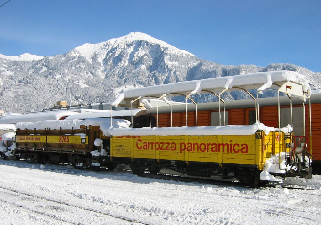 RhB open-air panorama car B 2093 together with the wagon 8765. Obviously