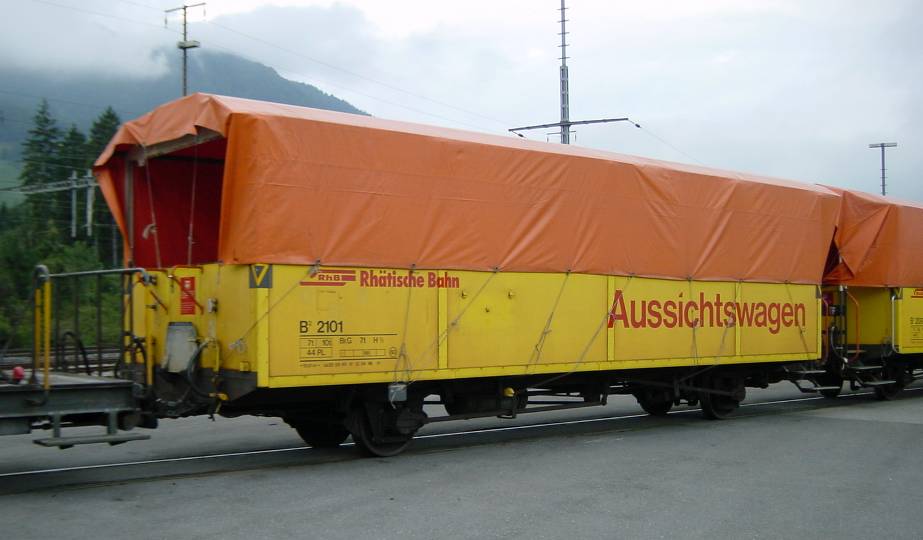 RhB Aussichtswagen B2 2101. Der Wagen ist mit einer Plane gegen Umwelteinflüsse geschützt. Landquart Güterbahnhof, 23. September 2001; Digital photo by Daniel Stieger (danielstieger@hotmail.com) |