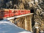 RhB train of line Chur - Arosa on one of the many bridges of the line.