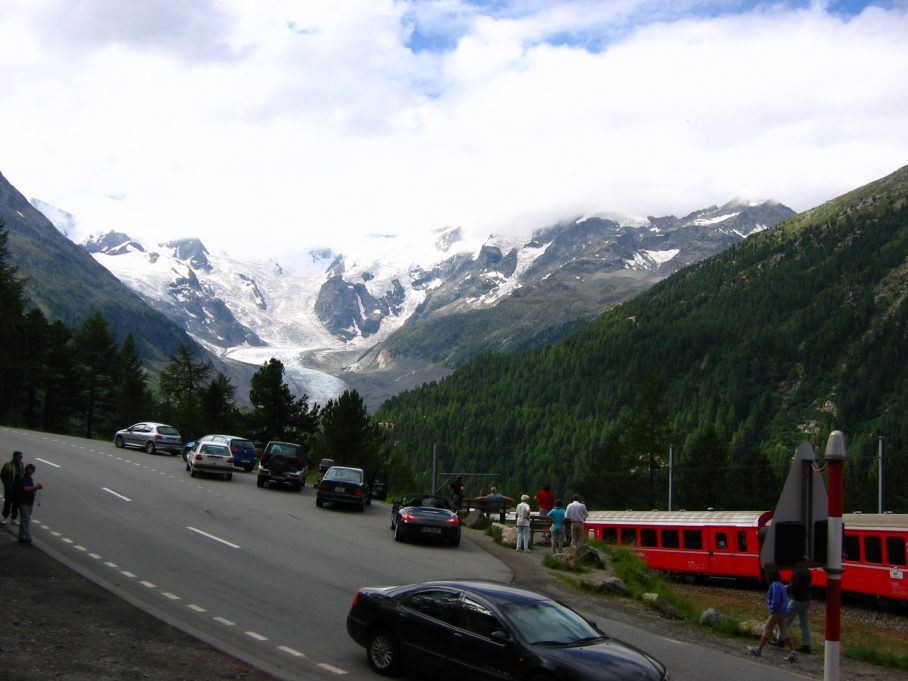 Rhätische Bahn/Berninabahn, Switzerland Crossing the Bernina road at the Montebello bend, first view towards the glaciers. Photo by Stephan R. Schilling August 2004, cervin@matterhorn.strs.de |