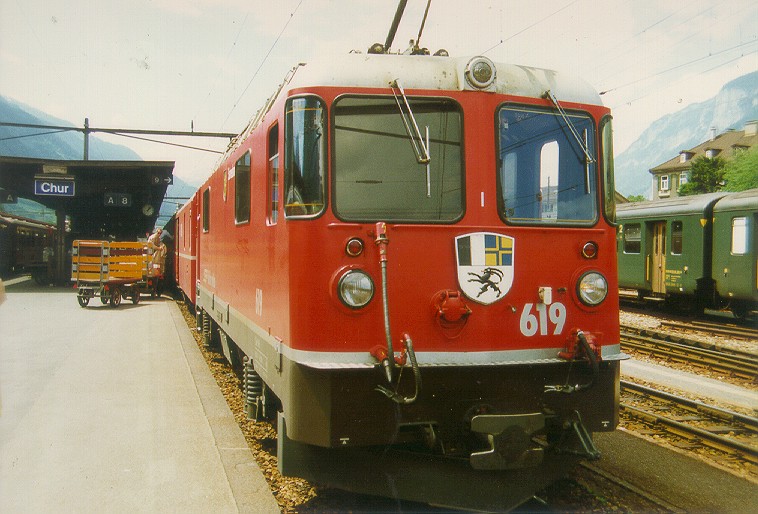 Elektrolokomotive 619 der Rhätischen Bahn in der neuen roten Lackierung im Bahnhof Chur. Electric locomotive 619 of Rhätischen Bahn in the new red livery at Chur station.