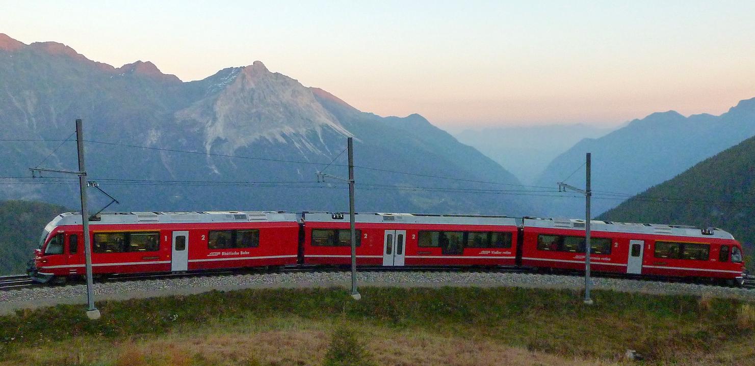 | RhB Allegra ABe 8/12 3506, Regio 4653 (Pontresina - Poschiavo), taking the famous panorama curve at Alp Grüm, 2011-10-02. The last trains of the day don't need any additional cars. They also have to heat up the landscape when going downhill as there are no trains going uphill to use their regenerated electricity. |