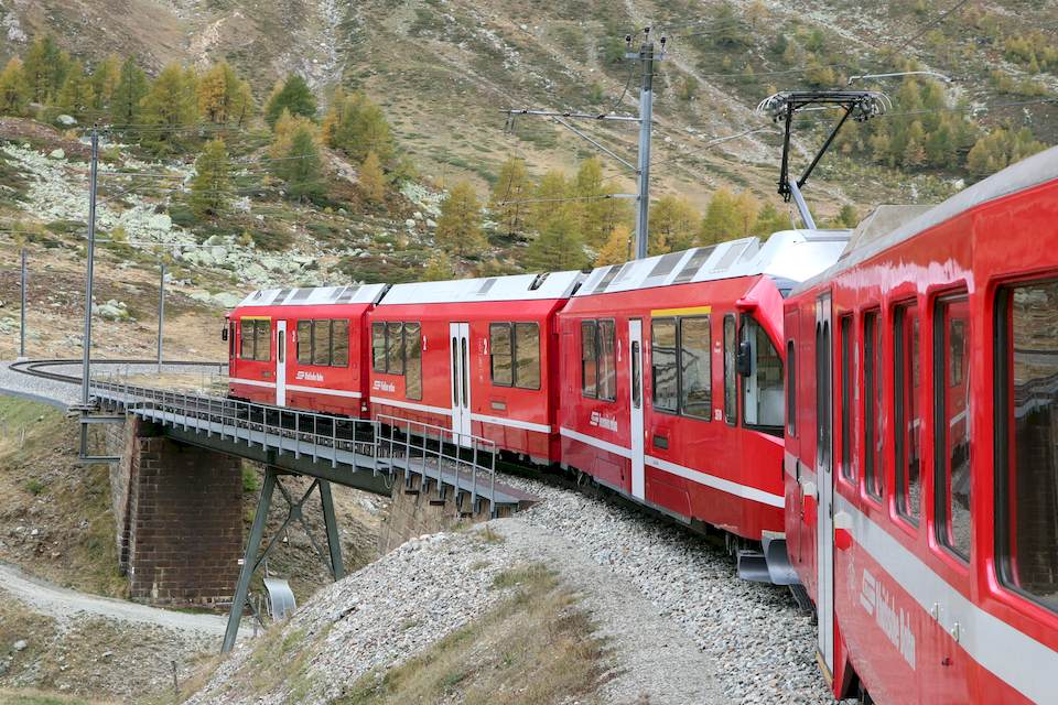 | RhB ABe 8/12 3510 "Alberto Giacometti", built 2010 by Stadler, Obere Berninabachbrücke (between Ospizio Bernina and Bernina Lagalb), 2019-10-05. |